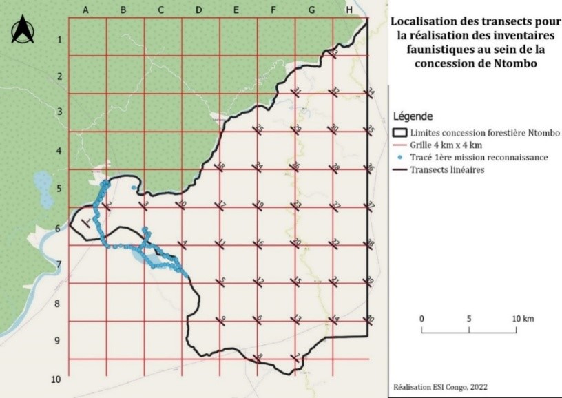 Des inventaires ont été réalisés entre décembre 2022 et mai 2023, La méthodologique utilisée est celle de transects linéaires avec les marches de reconnaissances (Hall et al., 1998 ; Walsh & White, 1999 ; Walsh et al., 2000).  La longueur des transects linéaires était portée à 1km séparé de marche de reconnaissance de 4 km. La densité des grands singes a été estimée par le comptage de nids, et celle des éléphants par le comptage de crottes en utilisant Distance 7.5. Les indices d’activités humaines ont également été relevés.